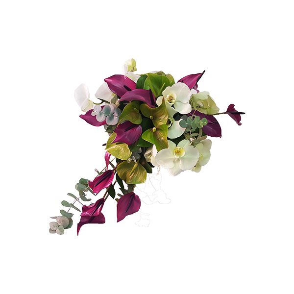 Buquê de Noiva confeccioado por Antúrio Roxo e Verde, Orquídeas e Eucalipto.
